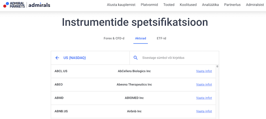 Soovi korral saad enne konto avamist ka täpsemalt uurida, millised instrumendid Admiral Markets platvormil saadaval on - Admiralsi kodulehel on sisukas instrumentide otsingufunktsioon.