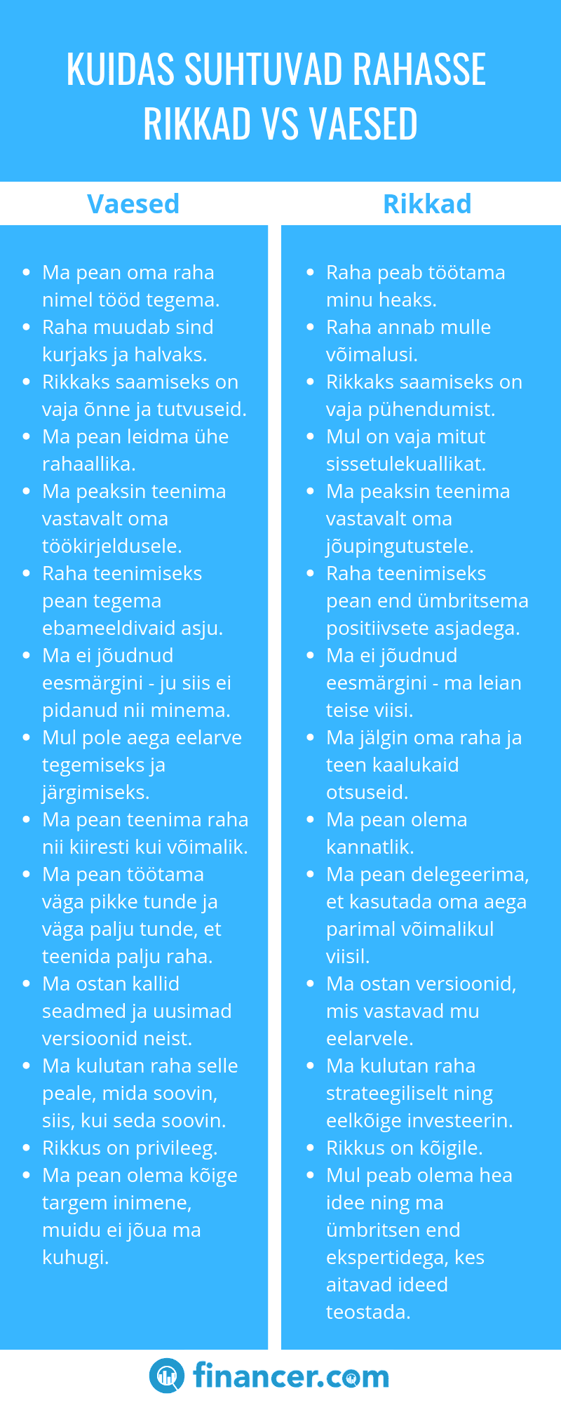 Ilma konkreetse mõtteviisi ja uskumusteta on peaaegu võimatu koguda rikkust, mis looks sulle eluaegse finantsilise vabaduse. Vaestel inimestel on teatud arusaamad maailmast, mis takistavad neil edasi liikumast, isegi, kui nad näivat pingutavat.