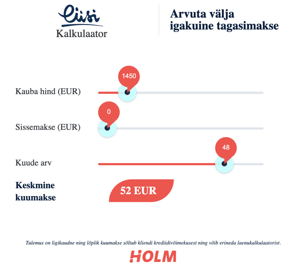 | Liisi järelmaks (Holm Bank) | 25 – 25 000€ | alates 9,9% | alates 0€ | 33,74% |